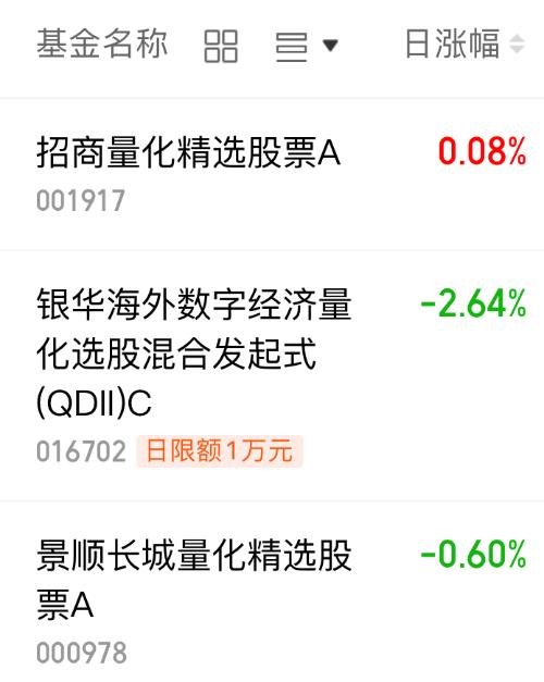 今天大盘震荡低开,三大指数涨跌不一,个股跌幅显著,昨天量化基金却能扛住压力逆势上涨,来看下昨日的涨幅具体情况:$招商量化精选股票A(OTCFUND|001917)$昨天上涨0.08%$银华海外数字经济量化选股混合发起式(QDII)C(OTCFUND|016702)$昨天下跌2.64%$景顺长城量化精选股票A(OTCFUND|000978)$昨天下跌0.60%#我国首批L3级自动驾驶车型获批上路#...