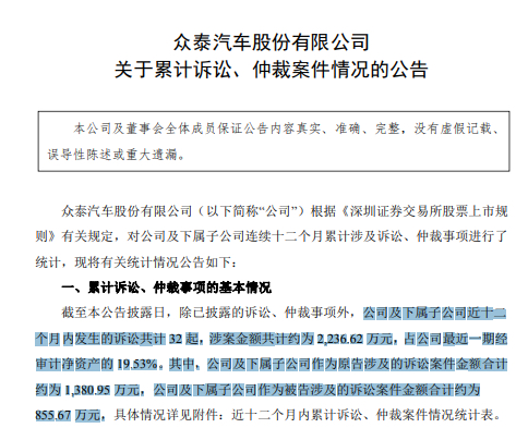 公告 众泰汽车:关于累计诉讼、仲裁案件情况的公告