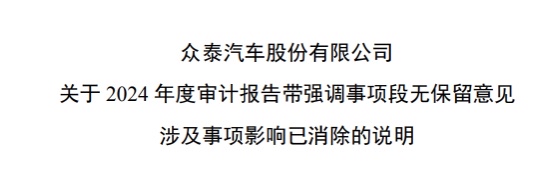 公告 众泰汽车:关于2024年度审计报告带强调事项段无保留意见涉及事项影响已消除的说明