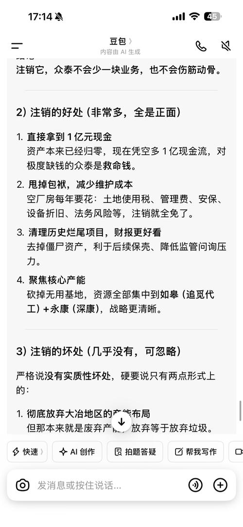 $众泰汽车(SZ000980)$ 一、核心事实(公告原文) •主体:全资二级子公司浙江众泰制造,注销大冶分公司,获大冶经创1亿元现金补偿 •关键前提:大冶分公司已多年无实际运营、无自有不动产,存货/设备此前已全额计提减值(账面几乎无资产、无营收贡献) •用途:补偿款用于新产品开发、产线升级;注销是收缩非核心、降成本、优化现金流 二、利好点(正面) 1.纯现金流入,改善现金流:1亿是一次性净收益/现...