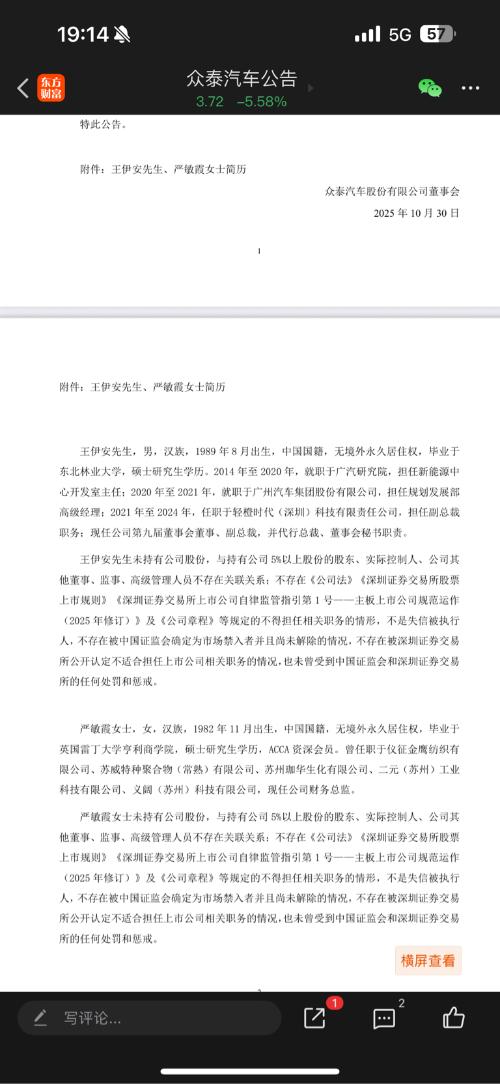 $众泰汽车(SZ000980)$ (特别说明:今天进了点) 1.经过一天不该有的拖延,昨晚,公司终于发布了《公司第九届董事会第一次会议决议公告》,同时还发布了《公司关于聘任高级管理人员的公告》,相关事项尘埃落定。我说这是不该有的拖延,是因为公告里明确写出,新董事会第一次会议正是在前天临时股东大会结束后的同一天召开的,所议事项也相当简单,本来没有理由不于前晚同时发布公告。为何拖延?公司当然不会说,但...