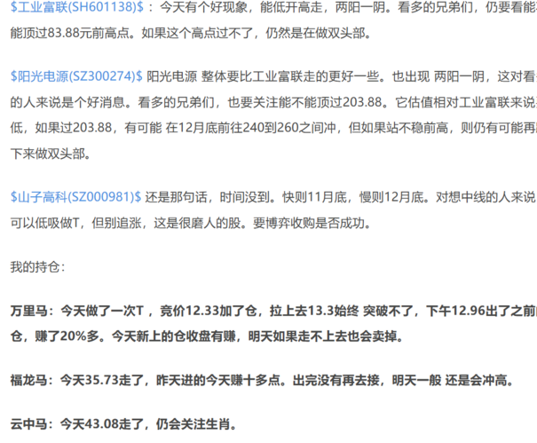 昨天的前瞻如上。 $工业富联(SH601138)$:能三阳夹一阴,多头占上风,能过83.88元前高的话,可再看高。 $阳光电源(SZ300274)$已经过前高203.88,明天观察能不能站稳,能的话,下周继续突破(未来可看到240到260元) $山子高科(SZ000981)$如前观点,时间没到,怎么折腾就是起不来。今天又跌 昨天新进的时空科技,已经大重仓,成本69.15了,今天收盘76,已赚10点...