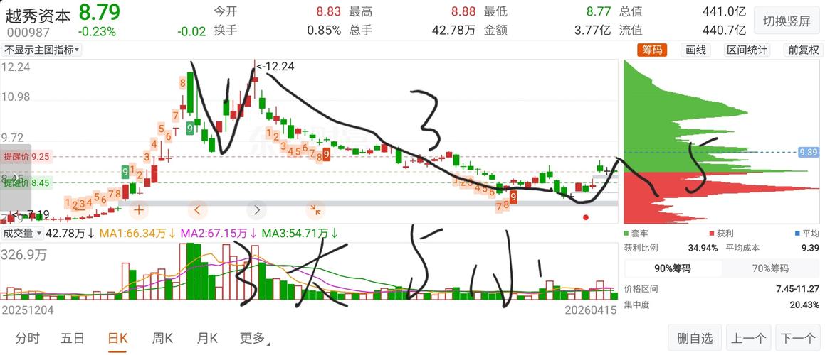 $越秀资本(SZ000987)$昨天8.7元买了底仓,今天8.5没到就没买。依然分三档买,8.5元元,8元,7.5元