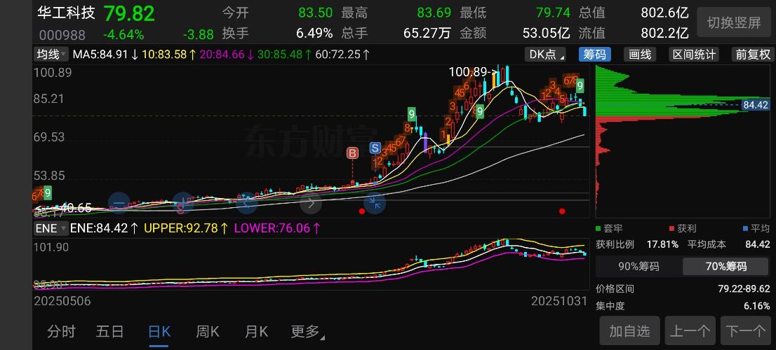 孤独南行 更新于 10-31 22:11 92次浏览 $华工科技(SZ000988)$这波从月线看大概率调到67 25