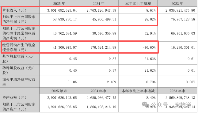 宠物道消息,4月17日,天元宠物(301335.SZ,市值33.74亿元)发布2025年年度报告,报告期内,公司实现营业收入30.02亿元,同比增长8.61%;实现归属于上市公司股东的净利润5884万元,同比增长28.02%;经营活动产生的现金流量净额4130万元,较2024年大幅减少76.60%(主要系公司宠物食品的期末预付金额增加所致)。 资料来源:天元宠物公告(下同) 公开资料显示,天元宠物...