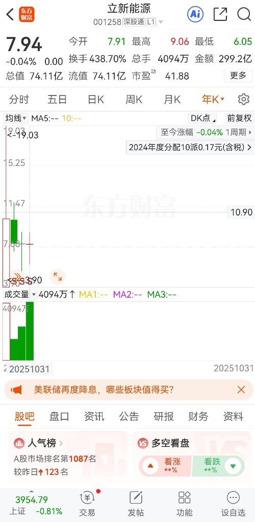 $立新能源(SZ001258)$ 近期跟踪立新能源(001258),从其年线级量价结构与近期盘面异动中,发现一些值得关注的信号,结合近期政策面动向,与各位股友探讨。 一、年线量价结构:长期支撑坚实,底部形态凸显 复盘该股上市以来的年K线(前复权): 2022年:天量成交3997万手,实体区间【3.90-10.30】,奠定了历史换手基础。其实体1/2分位约7.10元,成为后续关键支撑。 2023-2...