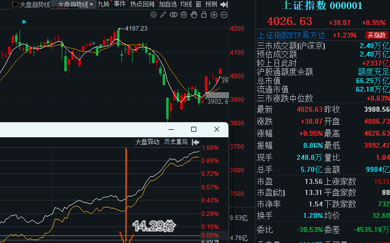 今天市场高开高走,全线大涨。截至收盘,上证指数涨0.95%,报4026.63点,收复4000点整数关口;深证成指涨1.61%,创业板指涨2.36%,报3558.53点,创2021年8月以来逾4年阶段新高;北证50涨1.17%。全市场超3700只个股上涨,其中71只涨停、10只跌停。 最提振信心的是成交量——两市成交额达2.39万亿元,较前一交易日放量超2337亿元,量价齐升的特征十分明显。 按照昨...