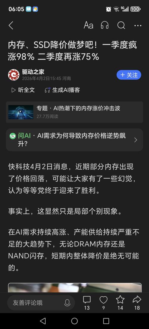 存储芯片的涨价潮,不但没结束,反而要加码了。 据韩媒爆料,三星电子和SK海力士已通知客户,计划在二季度大幅上调DRAM报价。三星已将PC端DDR4/DDR5合约价环比涨幅预期上调至40%至45%,超过了此前市场预测。 与此同时,NAND闪存价格已连续15个月上涨,3月环比再涨33.95%。一季度DRAM价格已环比飙升100%至115%,3月的短暂企稳只是因提前锁价,涨价趋势远未结束。 国家发改委价...
