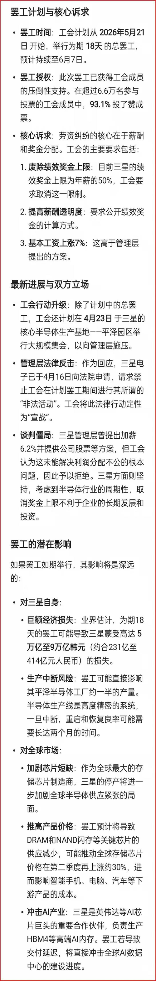【三星罢工18天,加巨存储危机!!!】根据17日早上最新信息,谈判陷入僵局,三星电子正面临其成立以来可能规模最大的罢工威胁。目前,工会与管理层的谈判陷入僵局,如果双方无法在近期达成一致,罢工行动将按计划展开。 罢工计划与核心诉求 *罢工时间:工会计划从2026年5月21日开始,举行为期18天的总罢工,预计持续至6月7日。 *罢工授权:此次罢工已获得工会成员的压倒性支持。在超过6.6万名参与投票的工...