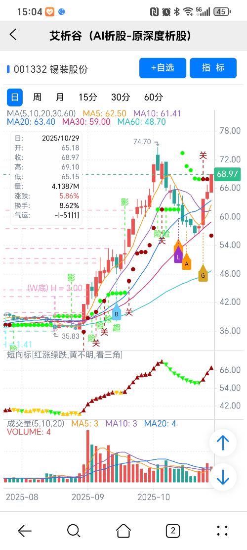 红绿小圆点是艾析谷的量化指标-超级短趋线,是趋势跟踪+突破类的量化指标,完全免费。 机会:股价上穿短趋线或绿变红; 风险:股价下穿短趋线或红变绿。 图中A、B、G、L关注标记是对应AI选股模型当天下午2点多给出。 想多了解艾析谷的股友,可以多看我的视频,或者问百度AI大模型。 AI模型选股,量化指标识别关键点,简单技术分析确定买卖点,结合量化和人工综合运用,才能有优势。 重点关注红绿转换,绿表示风...