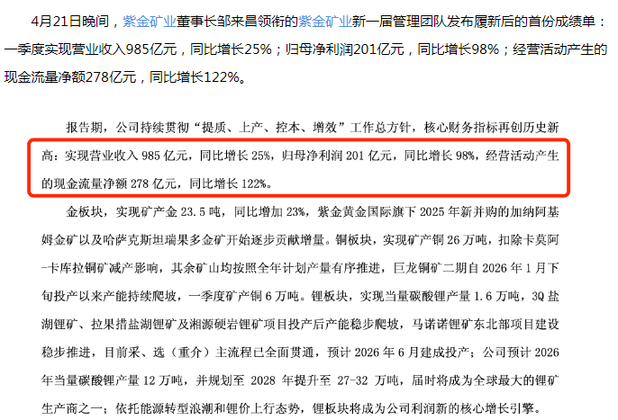 业绩暴增 ---- 紫金矿业2026年第一季度净利润 暴增