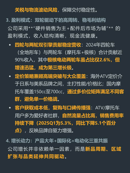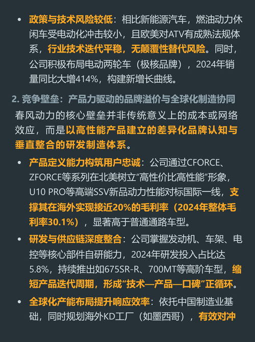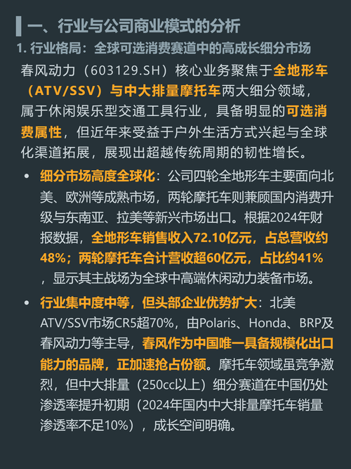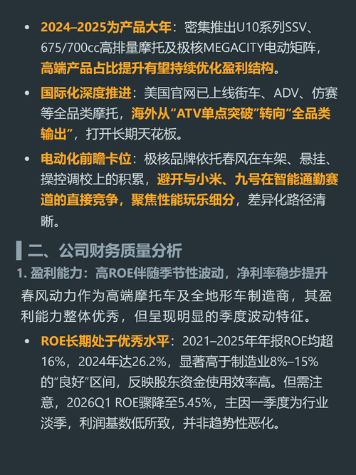 $春风动力(SH603129)$$钱江摩托(SZ000913)$$宗申动力(SZ001696)$你以为摩托车是夕阳行业?有个国产厂商靠卖成年人的“户外大玩具”闷声赚了十几年,ROE常年超20%,利润现金含量是普通制造企业的2倍多。 它就是春风动力,核心做两类产品。 四轮全地形车主打欧美户外市场,占总营收48%,是北美该赛道TOP5里唯一的中国品牌,正持续抢食国际巨头份额。 两轮中大排量摩托兼顾国内...