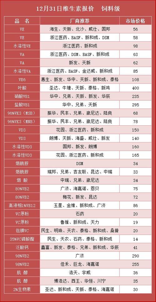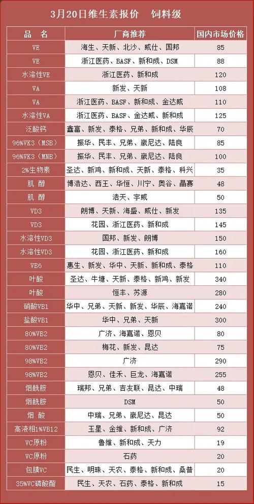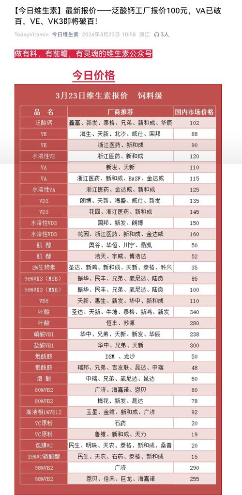 维生素涨价是周期反转+地缘冲击+寡头控盘的共振,当前仅处上涨中段,VA/VE/泛酸钙/蛋氨酸弹性最大,龙头业绩将持续释放。 信息仅供参考,不构成投资建议。 一、全品种涨幅(2025最低价→2026.3.21最高价,饲料级/原料级) 涨幅TOP(最猛) -蛋氨酸:17→39.5元/kg,+132%(欧洲停产+寡头控产) -泛酸钙(VB5):25→65元/kg,+160%(停报挺价) -维生素A(VA...