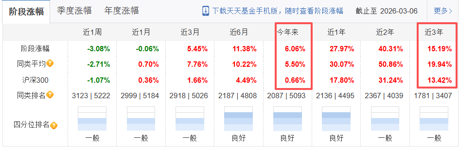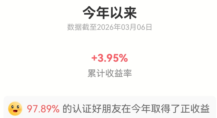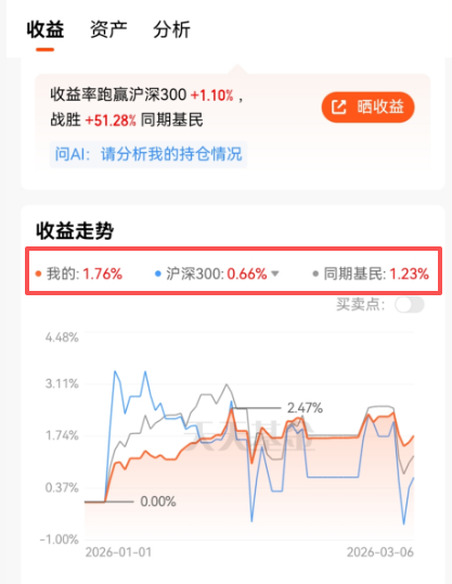 截止2026年3月7日,我在天天基金平台2026年的收益率是:1.76%,就这个数据,居然也战胜了同期基民的平均收益率1.23%,不敢相信这是真的。同期偏股基金的平均收益率为:5.50%,我是远远跑输的。在另一个只买偏股类基金的账户,我的收益率是3.93%,还是跑输了。话说偏股类基金,近几年表现是不太行的。近三年19.94%,表面上看领先了13.42%的沪深300指数,可如果算上全指收益率,沪深3...