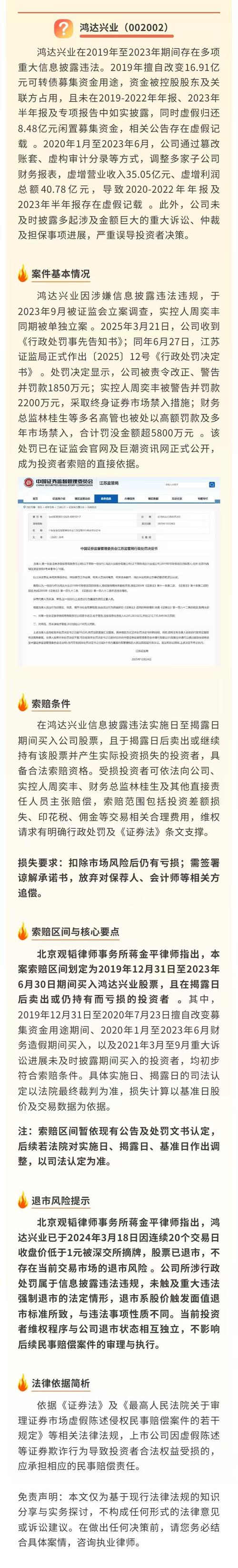 鸿达兴业索赔登记。督导券商、审计机构先后被处罚,公司连续四年大比例虚增收入利润、挪用募集资金等多项违规被处罚。上海则真律师事务所张猛律师团队提示:2020年4月28日至2023年9月22日期间有买入,无论之后卖出或继续持有,受损投资者可通过公号“索赔集结号”登记索赔。诉讼时效截至2026年9月22日。