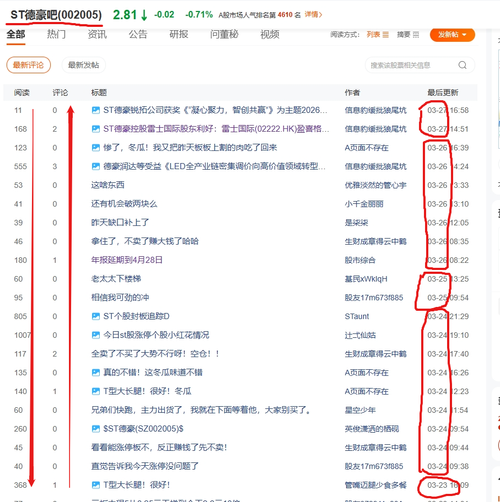 很少见到st德豪这样的股吧,冷清到让人无聊, 一天没几个帖子,一个版面的帖子回复时间跨过一个月度 很多帖子浏览是个位数,很多帖子回复是0 这说明什么?筹码高度控制,散户极少,有没有? 不在沉默中爆发,就在沉默中上天
