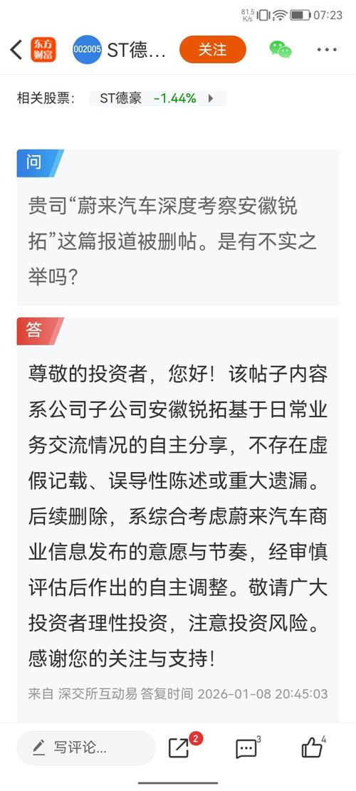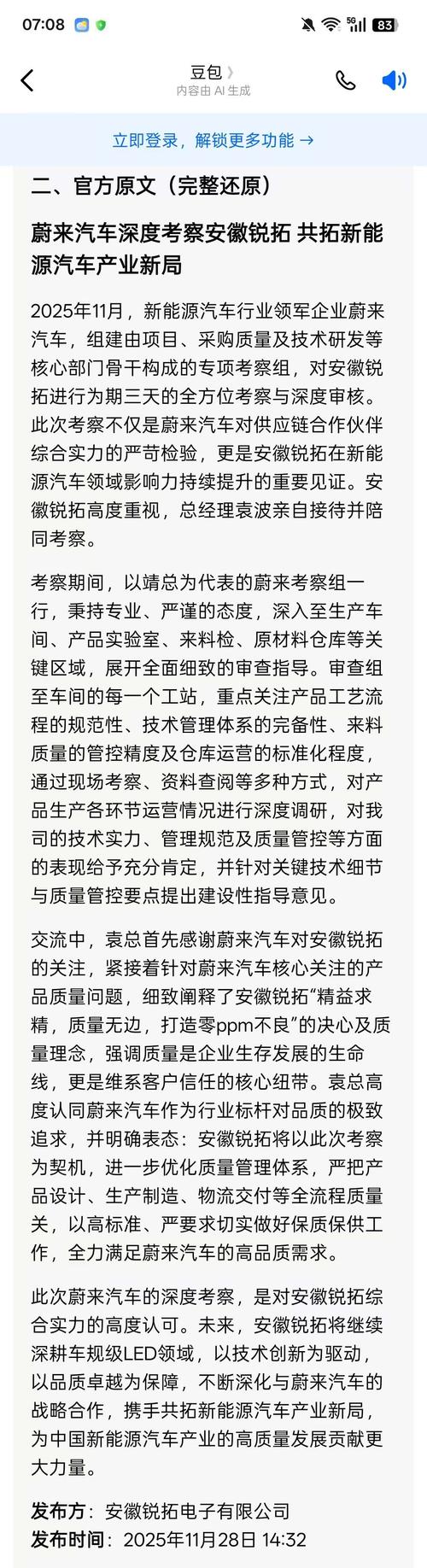 因涉及蔚来汽车9%与st德豪重磅商业机密利好若德豪润达 连续涨停被要求删除《ST德豪回应:系尊重蔚来商业信息发布意愿,事件真实无误,非虚假宣传: 蔚来汽车深度考察 安徽锐拓共拓新能源汽车产业新局》 蔚来汽车深度考察安徽锐拓·完整事件资料 一、核心事件概况 -事件主体:蔚来汽车×安徽锐拓电子有限公司(ST德豪旗下,蚌埠锐拓为核心车规级LED业务主体) -考察时间:2025年11月 -考察时长:3天全...