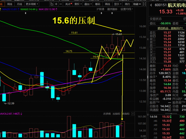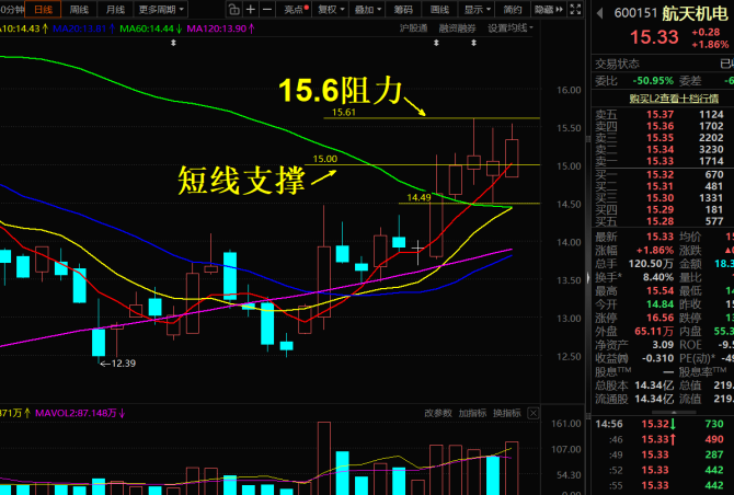 持仓股分析(不构成投资建议,仅供参考) $航天机电(SH600151)$ 央企改革,早盘低开缩量磨底,午后随商业航天板块回暖、放量上攻,一度冲(逼近15.6前高),但冲高后快速回落、尾盘收在15.33,留下上影线,明显遇阻15.5-15.6抛压区,不是有效突破、只是试探性冲高。成交额18.39亿、换手率8.40%,较昨日明显放量,但未达到突破15.6前高所需的强量能标准。今日资金流入约1.97亿,...