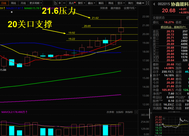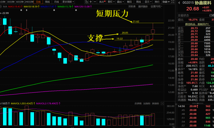 $协鑫能科(SZ002015)$ 4月23日#复盘记录##实盘记录# 今开:20.20,收20.68,+4.08% 最高:21.60,最低:19.21 今天受大盘联动板块共振拖累,协鑫能科早盘走出有序回落走势;午后13:30盘面开启强势回弹修复,过程不多赘述、存在吹嘘