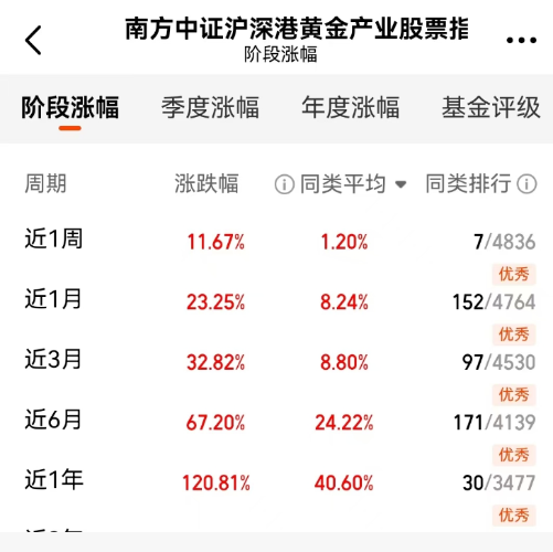 之前调整那阵子很多人下车了,今天这一反弹,估计肠子都悔青了。黄金这玩意儿,逻辑很简单,乱世它就是硬通货。$南方中证沪深港黄金产业股票指数发起A$(021958)$南方中证沪深港黄金产业股票指数发起C$(021959)这基,近6月同类排名第1,而且已经连续六期稳坐头把交椅,说明基金经理踩点踩得准。现在上车,买的是产业链的成长性,费用低,流动性还好,不用像存金条那样锁死资金。#藏金阁论金#