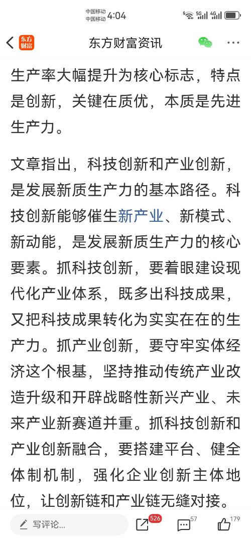 《因地制宜发展新质生产力》。文章强调,新质生产力是创新起主导作用,摆脱传统经济增长方式、生产力发展路径,具有高科技、高效能、高质量特征,符合新发展理念的先进生产力质态。它由技术革命性突破、生产要素创新性配置、产业深度转型升级而催生,以劳动者、劳动资料、劳动对象及其优化组合的跃升为基本内涵,以全要素生产率大幅提升为核心标志,特点是创新,关键在质优,本质是先进生产力。文章指出,科技创新和产业创新,是发...