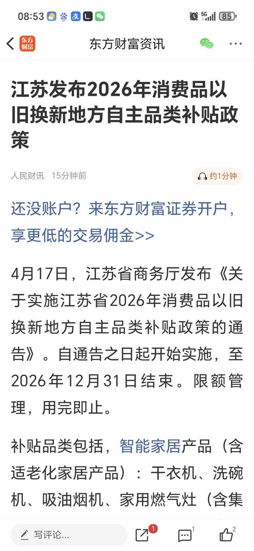 全靠江苏省支持了。江苏省已于2026年4月18日正式启动消费品以旧换新地方自主品类补贴政策,这是全国首个由地方自主实施的此类补贴政策
