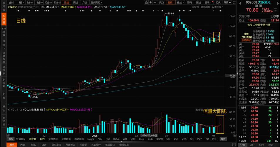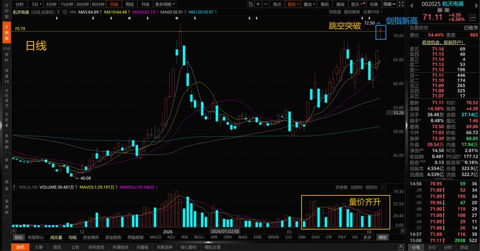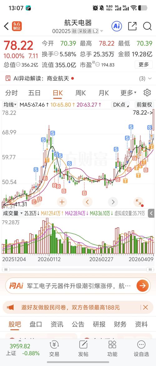 晚间话航天电器:今日回顾与明日展望 今日回顾 早盘70.39元开,最高冲至78.22元,最低下探70.39元,最终收盘78.22元,涨停10.00%,单日振幅11.01%,股价全天运行区间集中在70.39-78.22元。全天成交量26.84万手,成交额20.46亿,换手率5.91%,量比0.92,资金活跃度较前一交易日有所回落;委比100.00%,买盘力量封死涨停,内盘成交15.85万手,外盘成交...