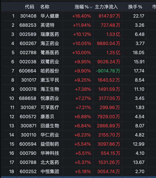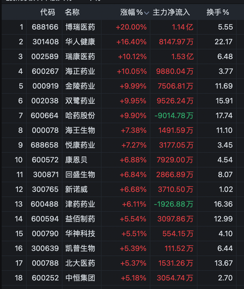 第一名:哈药股份现价4.44历史14.17 异动揭秘:创新药+仿制药一致性评价+流感 第二名:双鹭药业现价8.07历史32.16 异动揭秘:创新药研发+肝炎治疗+辅助生殖 第三名:康恩贝现价4.80历史:11.98 异动揭秘:流感+工业大麻+毛发医疗 第四名:瑞康医药现价3.59历史23.91 异动揭秘:医药生物+医疗器械+精准诊断 第五名:金陵药业现价8.26历史28.95 异动揭秘:医美概念+...