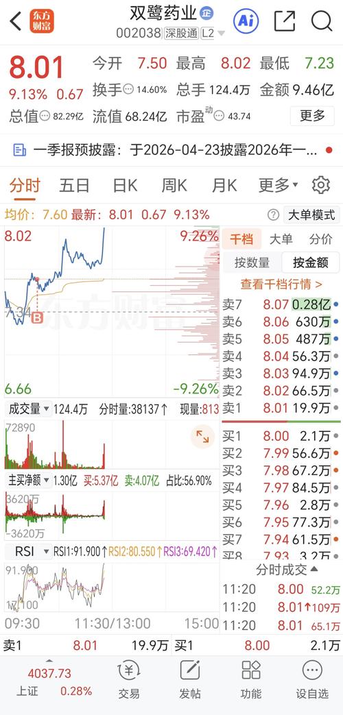 晚间话双鹭药业:今日回顾与明日展望 今日回顾:早盘7.50元开,最高冲至8.07元,最低下探7.23元,最终收盘8.07元,上涨0.73元,涨幅9.95%,单日振幅11.44%,股价全天运行区间集中在7.23-8.07元。全天成交量142.2万手,成交额10.90亿,换手率16.69%,量比1.08,资金活跃度较前一交易日有所提升;委比100.00%,买盘力量占绝对优势,内盘成交65.73万手,外...