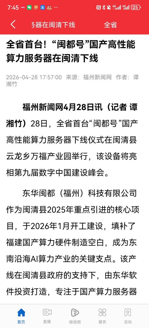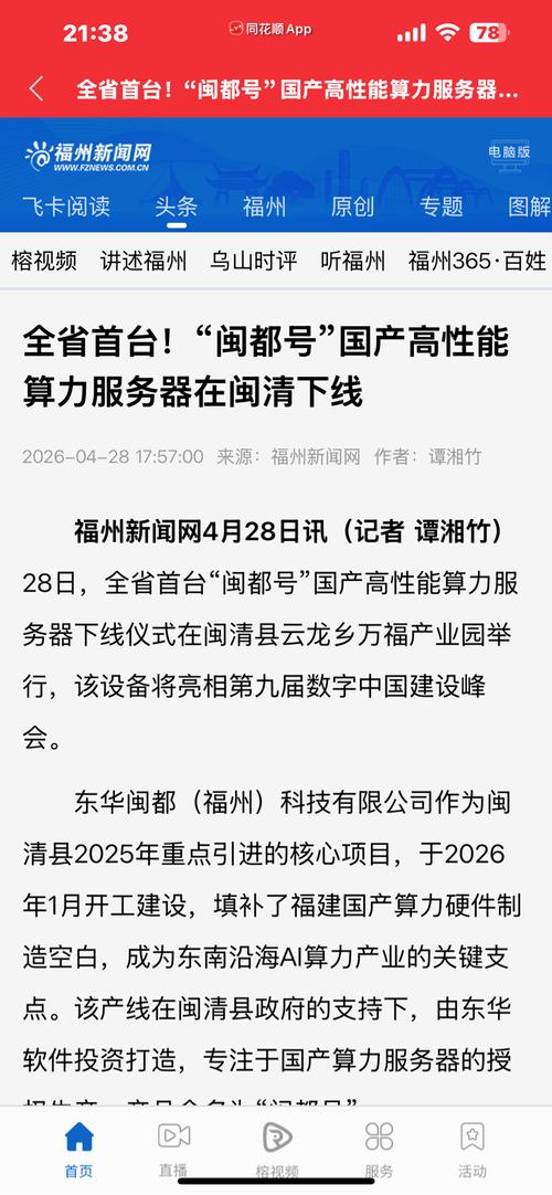 $东华软件(SZ002065)$2026-04-2817:57:00来源:福州新闻网作者:谭湘竹 福州新闻网4月28日讯(记者谭湘竹)28日,全省首台“闽都号”国产高性能算力服务器下线仪式在闽清县云龙乡万福产业园举行,该设备将亮相第九届数字中国建设峰会。 东华闽都(福州)科技有限公司作为闽清县2025年重点引进的核心项目,于2026年1月开工建设,填补了福建国产算力硬件制造空白,成为东南沿海AI算...