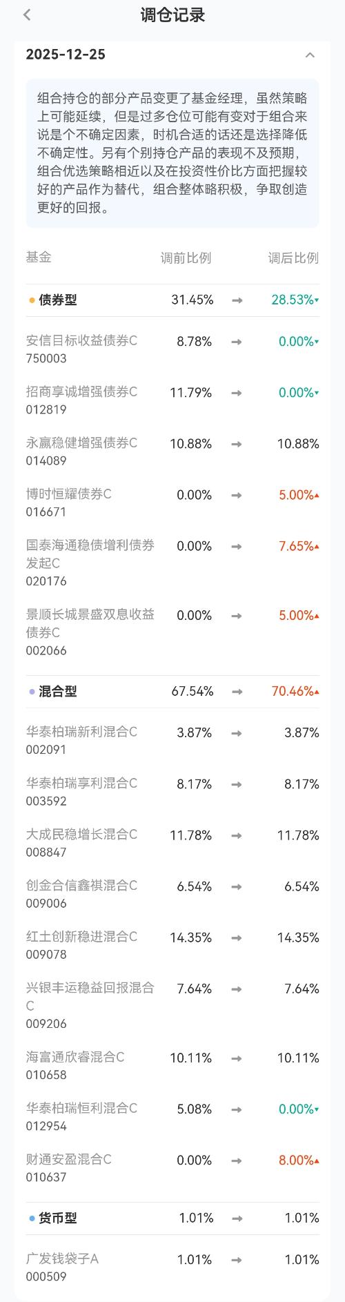2025年12月25日,【桃李春风】组合进行了2025年度第3次调仓,柠檬君来解读一下盈米基金的这次调仓。回望初心做好评价的第一步,先要了解这个基金组合!(老朋友可以直接跳过前2部分)这个组合的目标:通过大类资产配置,优选“固收+”基金标的,构建出令投资者安心的“固收+”基金组合,为长期投资者的资产保值增值提供一站式解决方案。希望如产品名字一样,给大家桃李春风的体验。几个关键词:大类资产配置(首先...