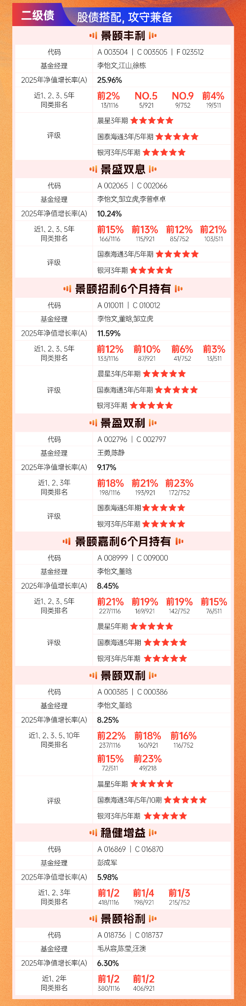 景顺长城基金丰富绩优产品合集:一级债:固收打底,转债力争增强二级债:股债搭配,攻守兼备偏债混合:固收筑底,以股进取$景顺长城稳定收益债券C(OTCFUND|261101)$、$景顺长城景颐丰利债券C(OTCFUND|003505)$、$景顺长城景盛双息收益债券C(OTCFUND|002066)$、$景顺景颐招利6个月持有期债券C(OTCFUND|010012)$、$景顺长城景盈双利债券C(OTCFUND|002797)$...