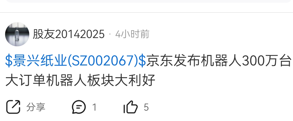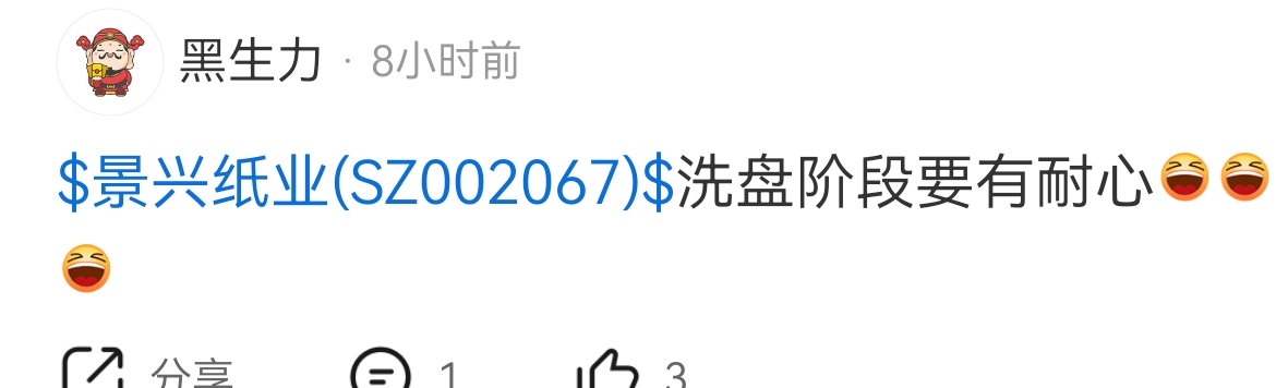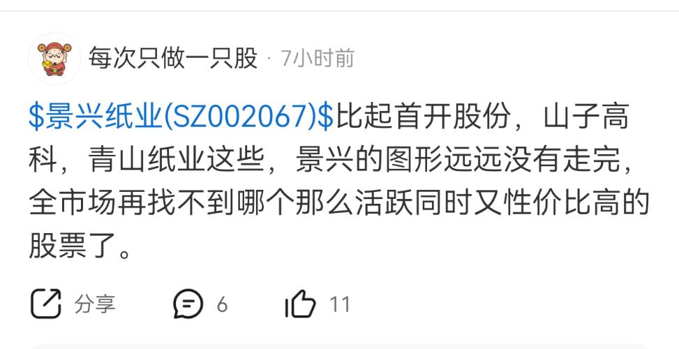 $景兴纸业(SZ002067)$起床打开股吧一看,连着七条无脑唱多的,这脑子是真敢蹭啊,天天在那碰瓷找利好,主力都加速跑四天了也没见回来。