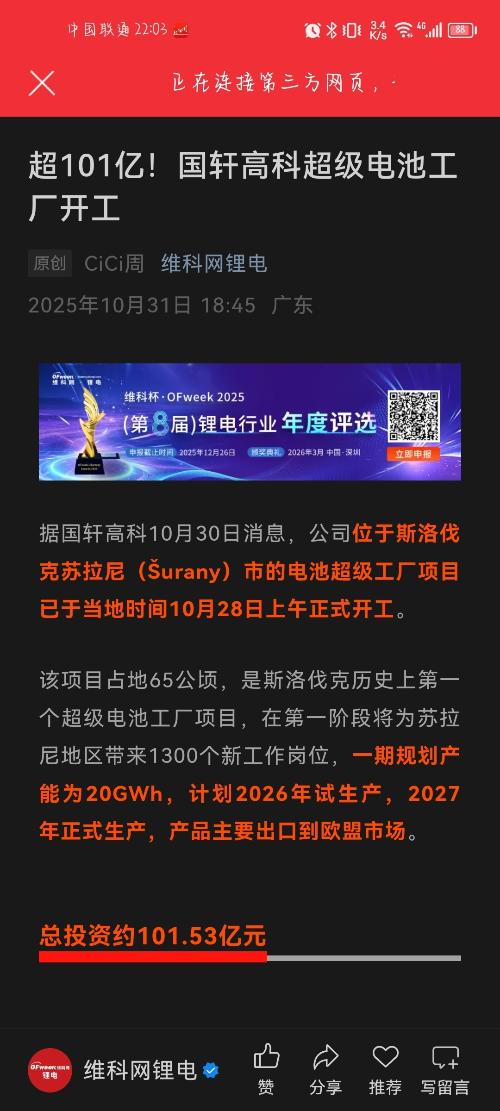 资讯 国轩高科斯洛伐克电池超级工厂开工,计划2026年试生产