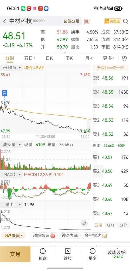 今天中材科技一步调整到位,明天反包收阳,收盘站上52元前高附近。