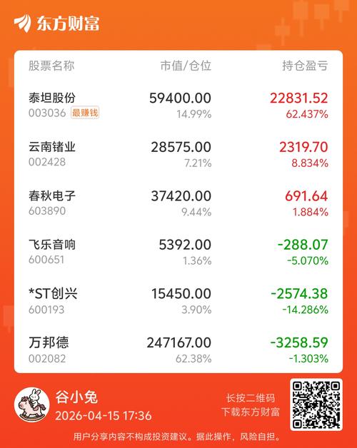 利通电子:涨停收87.95,公司可调度AI算力资源已超29,000P,全部对外出租,并与NVIDIA、超聚变等头部企业战略合作。 红板科技:涨停收68.40,公司具有生产1.6T光模块电路板的技术能力,相关业务正根据客户需求有序推进。 万邦德:今日早盘冲高了一波,最后还是收绿,市场那么好,还是不太好,该考虑止盈了。宁王是在3月24日建仓布局的,一直持有到现在,目前获利还剩54%。 2026年4月份...