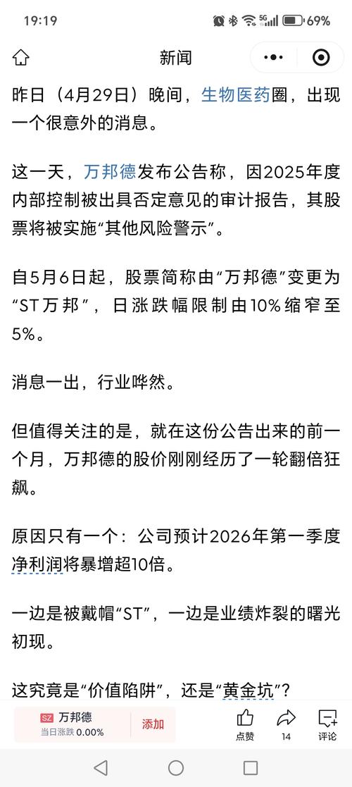 $万邦德(SZ002082)$今晚偶见要被ST了,惊讶。前段时间涨那么好,我7块的本在30块就出了,几天不见竟然这样了,感谢主力的拉伸,也期待着拨云见云时。
