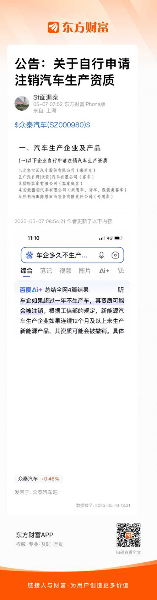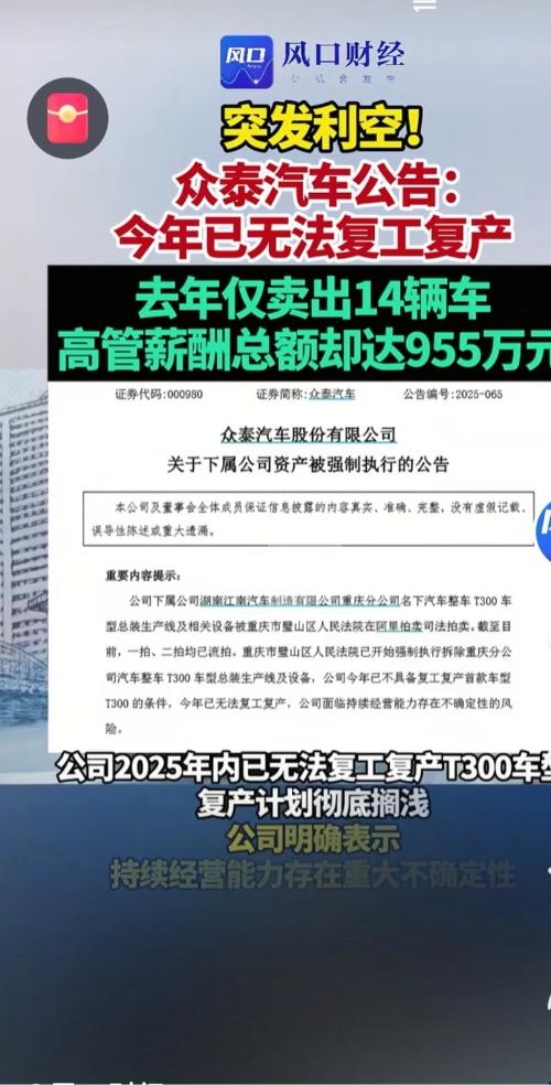 公告已多次提示警告意思很明显。担心… S t后股民索赔。众泰一年未生产车,只卖了14辆库存