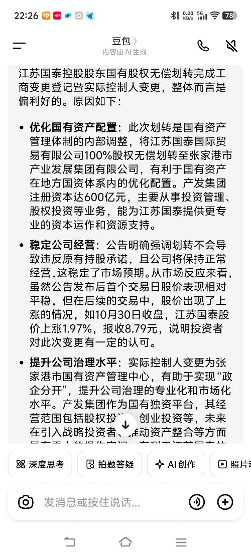 格隆汇11月6日丨江苏国泰(002091.SZ)公布,公司接到产发集团通知,张家港市人民政府将国际贸易100%股权无偿划转至产发集团的工商变更登记手续已办理完成,国际贸易取得了由张家港市数据局换发的《营业执照》。本次工商变更登记手续办理完成后,公司控股股东仍为国际贸易,产发集团为间接控股股东,实际控制人变更为张家港市国有资产管理中心。