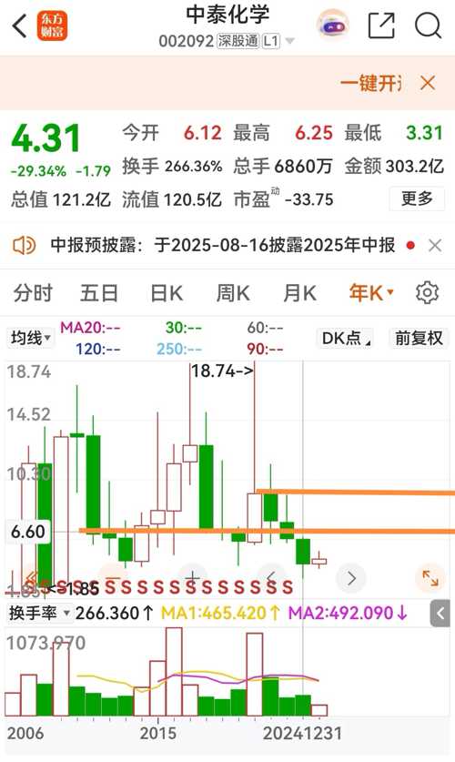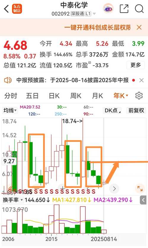 中泰化学,底部区域,适量建仓。 按照年K线,连续3年阴K线之后,大概率有一根大阳,从现在至2025年12月311日,会有至少20%以上的大阳线,待验证