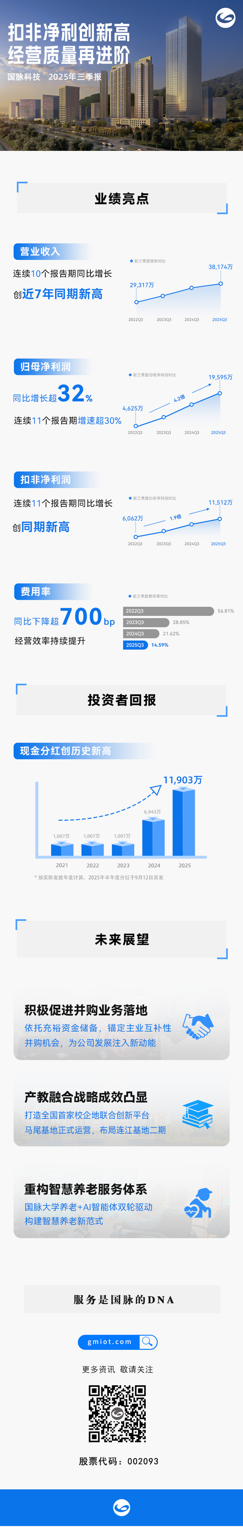2025年前三季度,公司业绩延续高增长态势,归母净利润连续11个报告期同比增速超30%;经营质量同步提升,扣非净利润亦实现连续11个报告期同比增长,创同期历史新高,主业盈利韧性持续凸显。 报告期内,公司未来战略业务稳步发展:首个模拟居家养老的身联网社区“国脉大学养老”与居家养老AI智能体形成协同生态,通过技术与场景深度融合重构智慧养老服务体系。产教融合成效凸显,推动公司经营效率大幅提升,整体费用率...