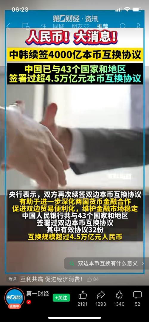 $青岛金王(SZ002094)$经国务院批准,近日中国人民银行与韩国银行续签双边本币互换协议,互换规模为4000亿元人民币/70万亿韩元,协议有效期五年,经双方同意可以展期。 双方再次续签双边本币互换协议,有助于进一步深化两国货币金融合作,促进双边贸易便利化,维护金融市场稳定。