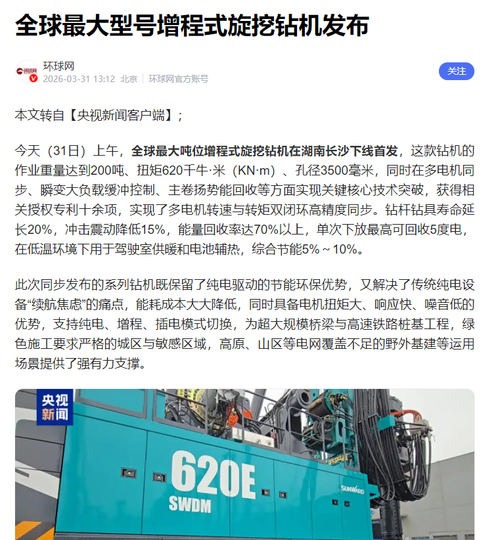 今天(31日)上午,山河智能(002097)制造的全球最大吨位增程式旋挖钻机在湖南长沙下线首发,这款钻机的作业重量达到200吨、扭矩620千牛·米(KN·m)、孔径3500毫米,同时在多电机同步、瞬变大负载缓冲控制、主卷扬势能回收等方面实现关键核心技术突破,获得相关授权专利十余项,实现了多电机转速与转矩双闭环高精度同步。钻杆钻具寿命延长20%,冲击震动降低15%,能量回收率达70%以上,单次下放最...