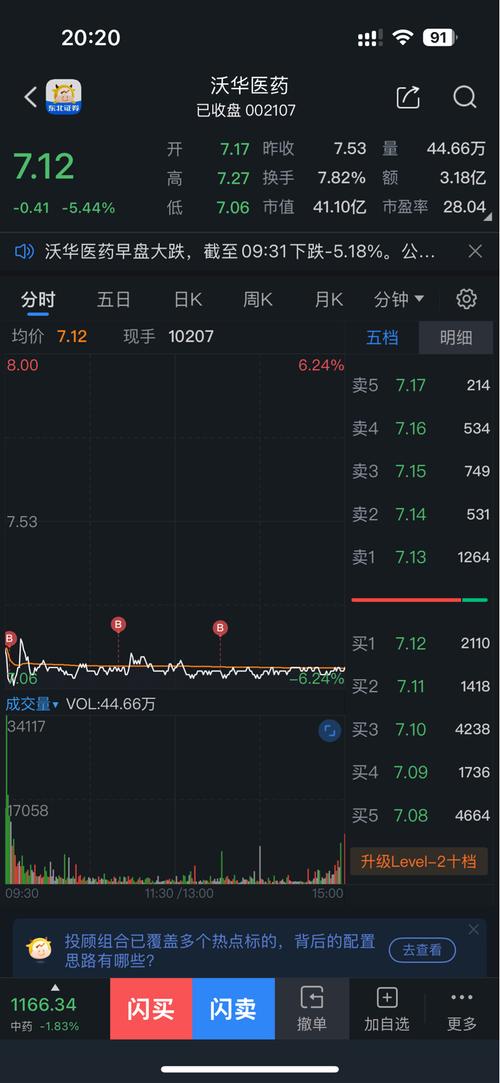 $沃华医药(SZ002107)$ 收盘数据(4.13) •收盘价:7.12元,跌幅-5.44%(-0.41元) •开盘:7.17元;最高:7.27元;最低:7.06元 •成交量:44.66万手;成交额:3.18亿元(较前日缩量) •换手率:7.82%→活跃度降温 •市盈率TTM:37.53(中等估值) 1.分时:弱势阴跌,全天受压 •小幅低开后无力翻红,震荡下行 •日内反弹极弱,始终在均价线下方 ...