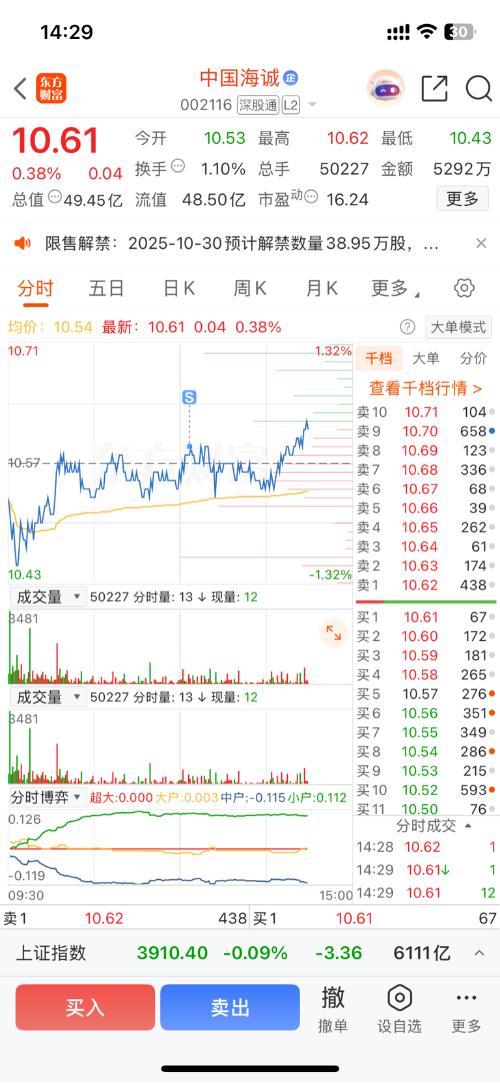 $中国海诚(SZ002116)$今天破10元,寻求关中支撑