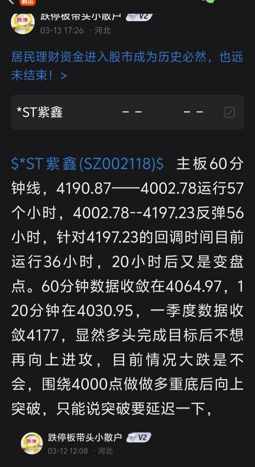 $*ST紫鑫(SZ002118)$<列子,仲尼>有这样一段话:目将眇者,先睹秋毫;耳将聋者,先闻蚋飞;口将爽者,先辨淄渑。。。 这段时间不好做,基本上是结构性的行情。没有持续性的主线。多数股票下跌,个股杀跌惨不忍睹,散户的心态接近崩溃,,,那么好多人就开始质疑怀疑会不会因为外部环境不好深度回踩呢? 个人看目前过度回踩的概率非常低,就是围绕4000——4200做一个多重底的中枢,之后再向上突破。预计...