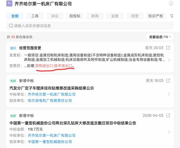 $ST汇洲(SZ002122)$既然发帖了,就多发一点点。 汇洲智能旗下的齐齐哈尔第一机床厂(简称「齐一机床」),就是「十八罗汉」里专门负责「重型立式车床」的核心龙头,是中国重型机床的开创者和标杆。最近工商变更后新增了「货物进出口;技术进出口」 1.战略升级信号:这是公司从「国内制造+维修」向「全球化业务」拓展的标志性动作。之前的经营范围以国内机床制造、设备改造为主,新增进出口权后,具备了直接开展...