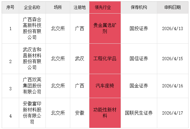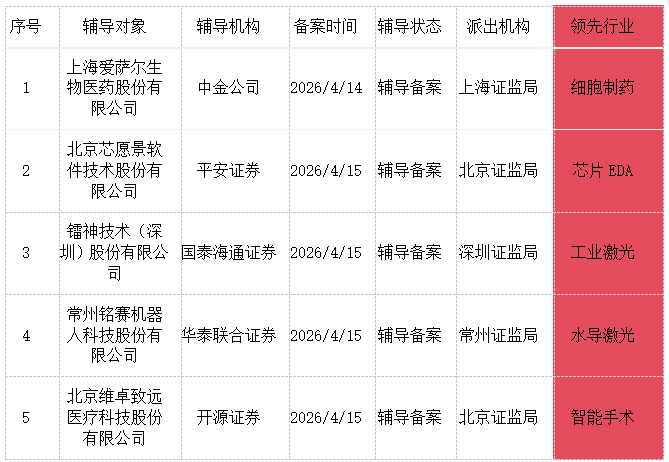 导语:本周IPO市场硬核科技主题持续。细胞制药、芯片EDA、工业激光、智能手术领域的5家创新企业集中启动辅导备案。同时,电子测量仪器龙头苏州联讯仪器以81.88元/股高价发行,4家“专精特新”企业迎来北交所上市委审议,覆盖环保、化工、汽车、新材料等多个实体领域。 根据中国证监会、沪深北交易所官网信息显示,本周2026年4月13日-4月18日,IPO:5家企业启动辅导备案,4家IPO新股发行,3家I...