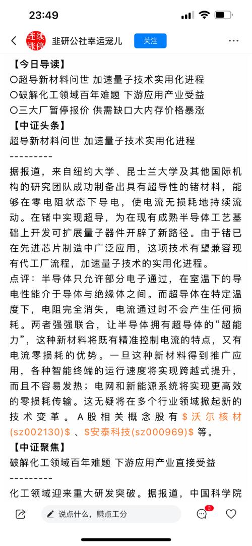 资讯 【中证快报】11月3日中证投资资讯 | 超导新材料问世加速量子技术实用化进程
