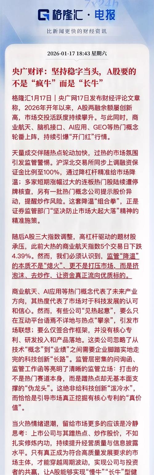 2026-01-1713:41:40来源:央广网 1月15日,中国证监会召开2026年系统工作会议,强调坚持稳字当头,巩固市场稳中向好势头。证监会强调,严肃查处过度炒作乃至操纵市场等违法违规行为,坚决防止市场大起大落。 2026年开年以来,A股两融余额屡创新高,市场交投活跃度持续攀升。与此同时,商业航天、脑机接口、AI应用、GEO等热门概念轮番上阵,持续引爆“开门红”行情。 天量成交伴随热点轮动加...